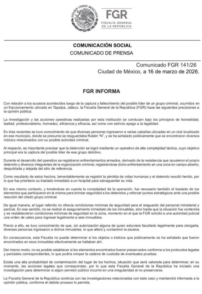 Ciudad de México, 17 de marzo de 2026. En un comunicado oficial emitido el lunes 16 de marzo por la Fiscalía General de la República (FGR), bajo el número 141/26, la institución federal reconoció que no resguardó de inmediato las cabañas ubicadas en el fraccionamiento de Tapalpa, Jalisco, donde presuntamente se ocultaba Rubén Oseguera Cervantes, alias “El Mencho”. La FGR justificó esta omisión por la ausencia de “condiciones mínimas de seguridad para el personal ministerial y pericial”.